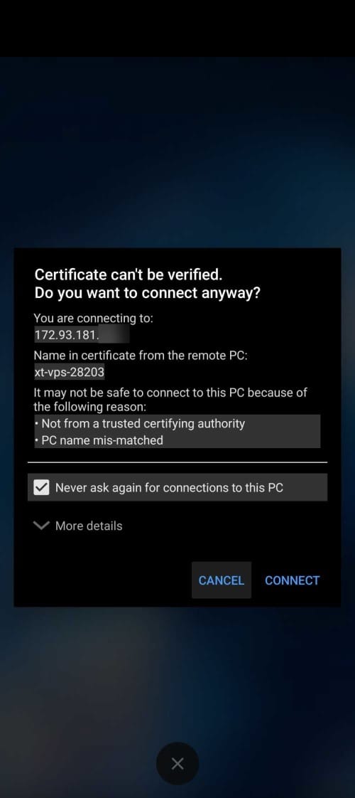 Certificate warning? This is normal on first connection. Tap Accept/Yes to proceed. It's not a security issue with your VPS — it just means your device hasn't seen this server before.