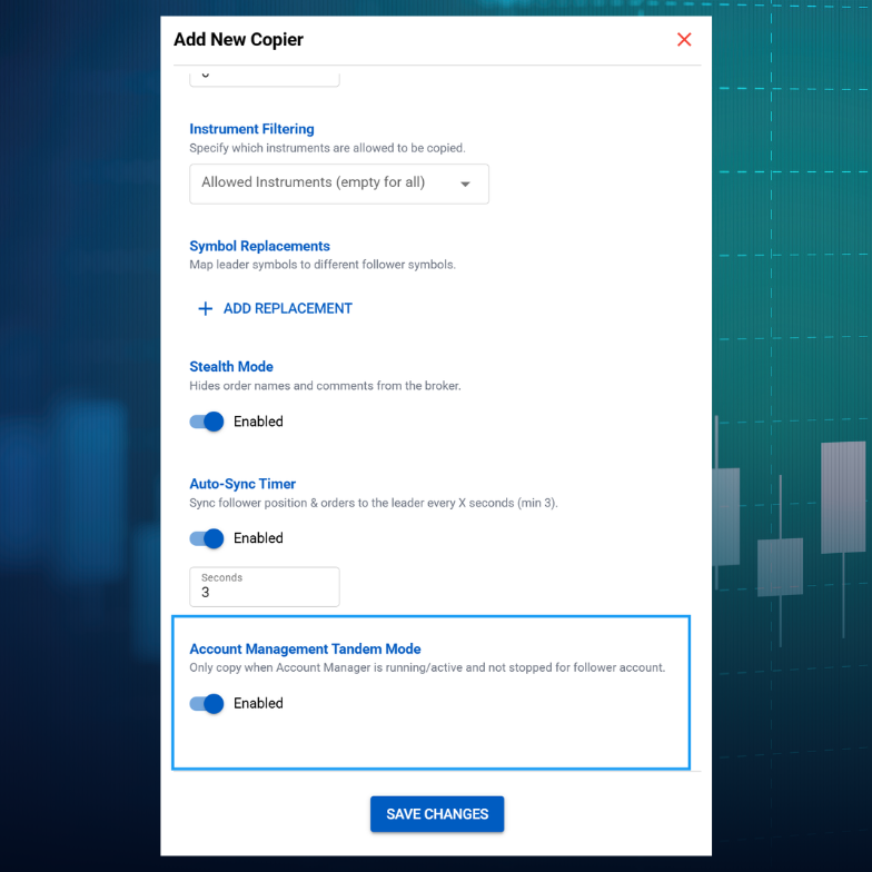 Tandem Mode. Binds copying behavior to your Account Manager monitors. When a NAM threshold is breached and the monitor stops, all linked copiers halt immediately. Prevents the scenario where copying continues after your leader account has been flattened by risk management.