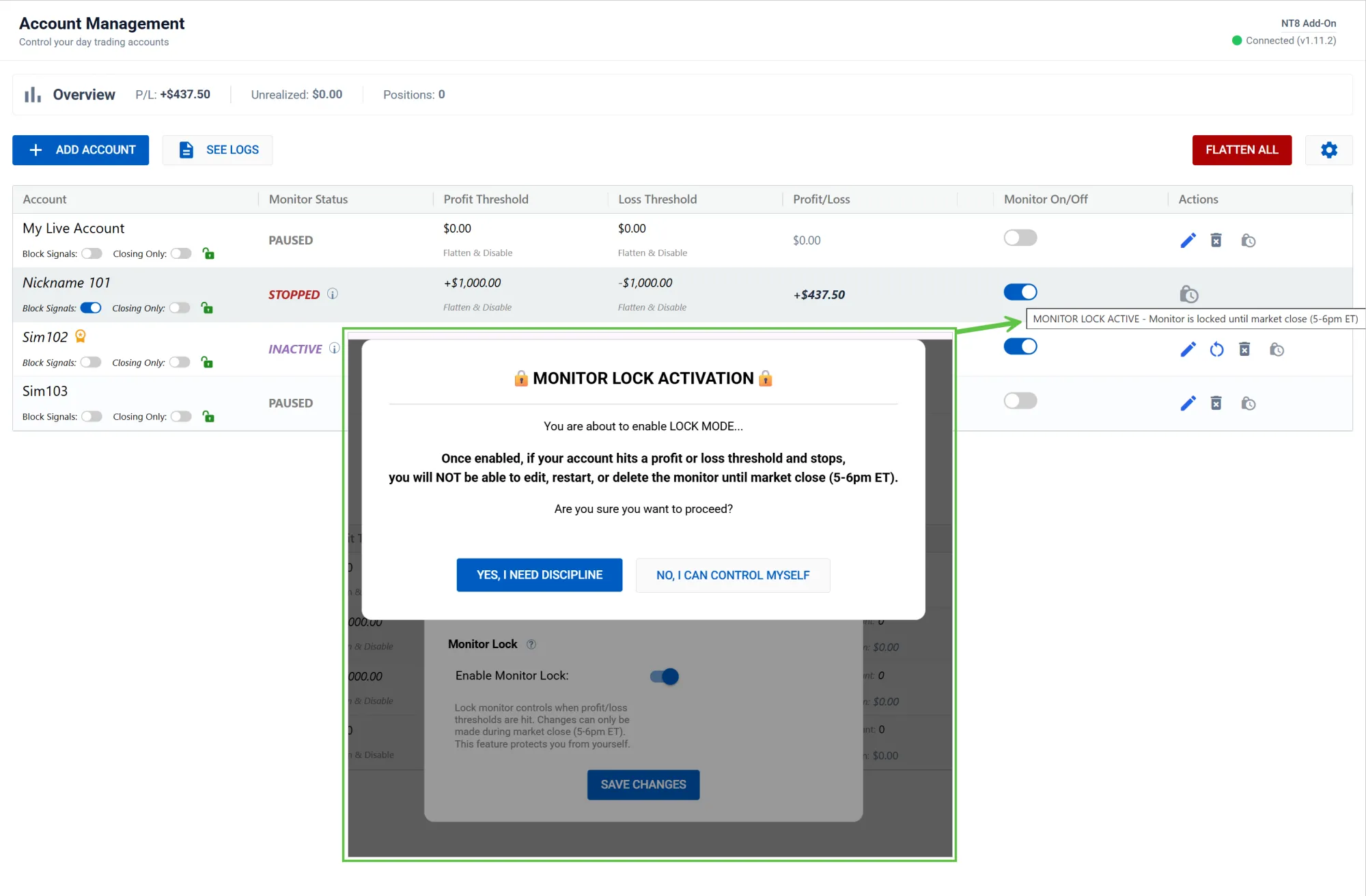 Now when your account monitor stops for the day, you'll see a confirmation dialog asking if you want to enable lock mode. Once activated, the monitor cannot be restarted until the trading day ends.