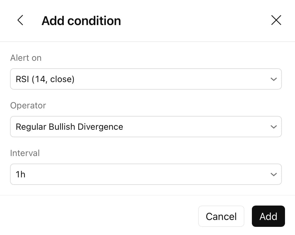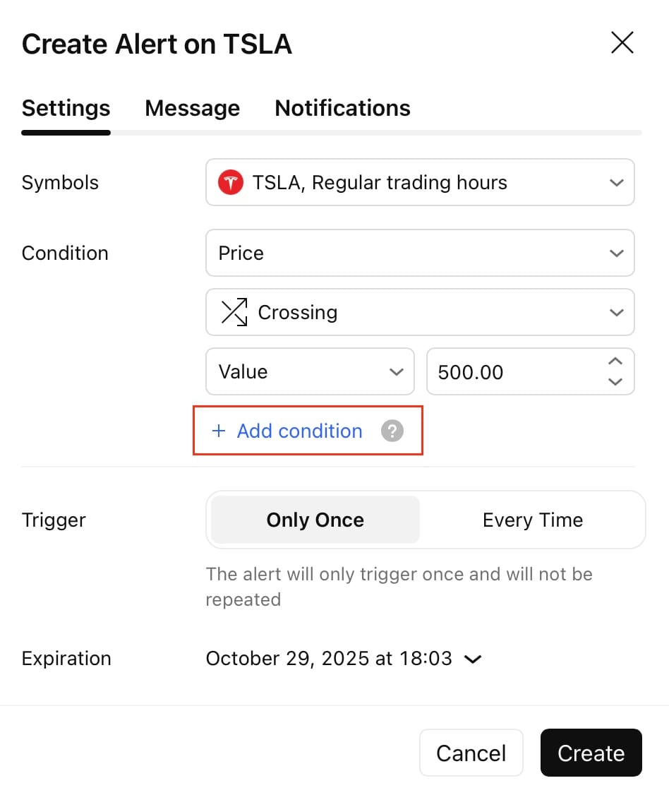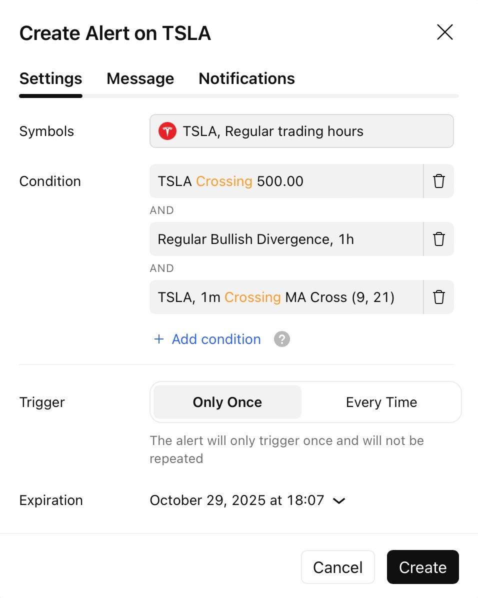 The setup is straightforward. Open the alert creation dialog, click "Add condition," configure each condition, and they'll appear as buttons with previews that you can edit anytime. Each condition can be based on price, indicators, or drawing tools, giving you plenty of flexibility to match your actual trading methodology.